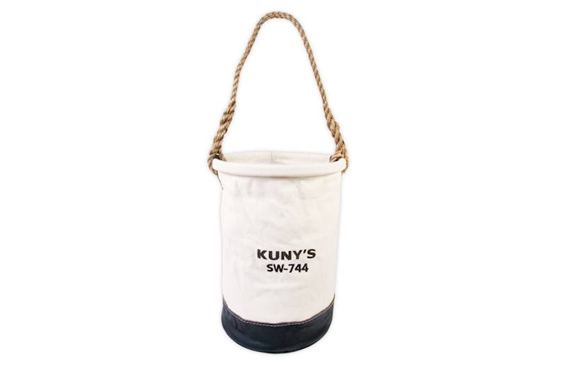 Made of top grade heavy-duty canvas material and high strength top ring Bottom is covered with top grain leather for strength and durability Polypropylene (back-braided) rope handle,reinforced with leather and grommet eyelets where it is spliced around top ring One inside pocket